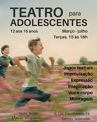 Curso de teatro para adolescentes (12 a 15 anos) que desenvolve expressão, criatividade, autoestima e trabalho em grupo por meio de jogos, improvisações e criação coletiva, culminando na apresentação de cenas construídas ao longo do processo.